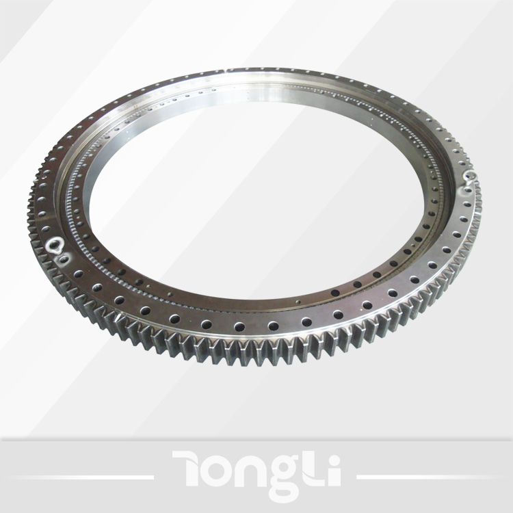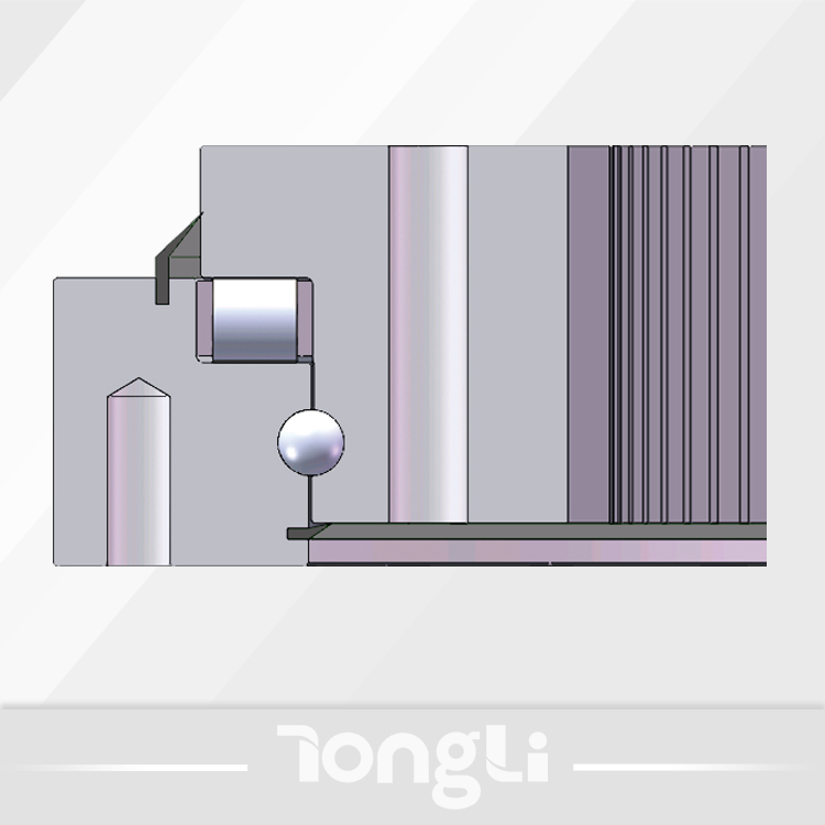 球柱聯(lián)合式回轉(zhuǎn)支承有兩排滾道組成,一排為滾柱,承受軸向力,一排為鋼球,承受軸向力、徑向力和傾覆力矩。主要承承受大軸向力、小徑向力和傾覆力矩的工況。